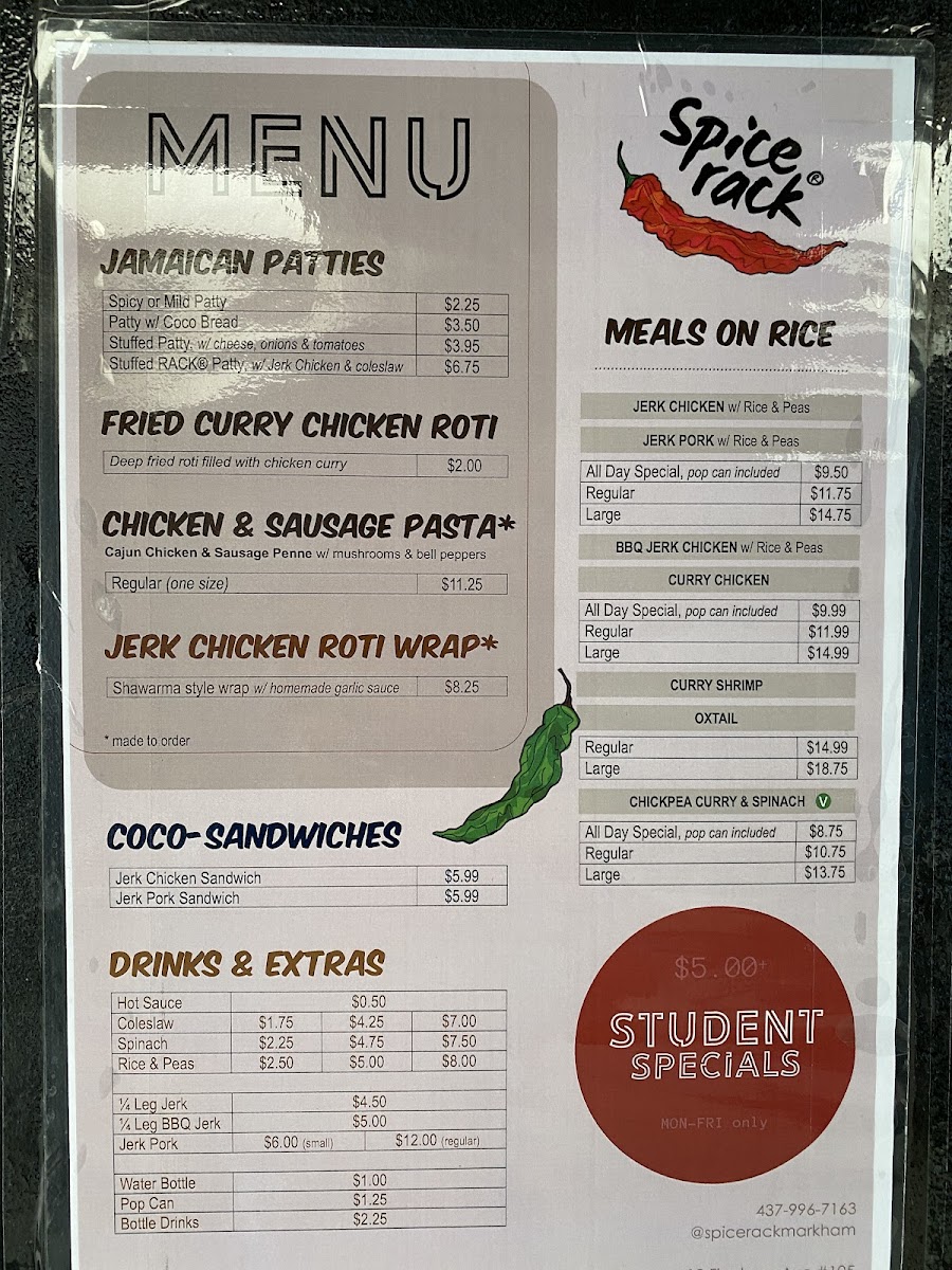 Spice Rack offers a fusion menu that brings together bold Caribbean flavors in a casual, inviting setting. The focus is on hearty, satisfying meals that work well for lunch, dinner, or a comforting mid-day bite. You’ll find dishes like jerk chicken served with traditional rice and peas, as well as options such as curry chicken, oxtail, and various patties that make for easy, flavorful meals anytime you’re craving something with spice and warmth.